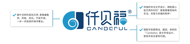 品牌識別的嶄新設(shè)計(jì)以「海洋」為主體,商標(biāo)的主體是福字型 海洋貝殼+中式文字的仟貝福+現(xiàn)代簡約英文Canbeful