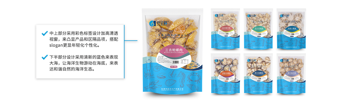 包裝的外觀設(shè)計(jì)主體為藍(lán)色海底色,搭配矢量寫實(shí)海洋生物,如同包裝內(nèi)的新鮮海鮮食材 ,傳達(dá)著自然、美味、安心的產(chǎn)品特色與信息。中上部的Slogan 凸顯出 專屬 個性化的體驗(yàn)理念。從中央往外延伸出的雙拼色帶,則以青春,悅動的色彩表現(xiàn),作為各產(chǎn)品系列品項(xiàng)之間的區(qū)隔。